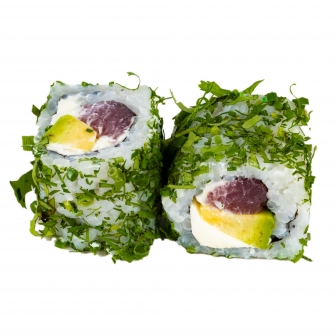 Rouleaux de Maki inversés avec de la coriandre, de la ciboulette, de l'aneth, du thon, du cheese et de l'avocat, servi par 6