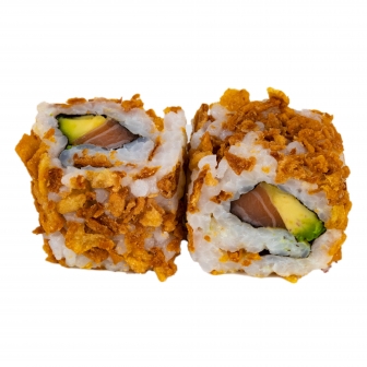 Rouleaux de Maki inversés avec de l'oignon frit, du saumon et de l'avocat, servi par 6