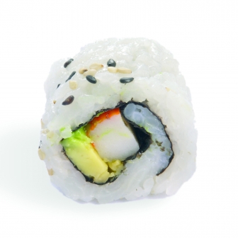 Rouleaux de Maki inversés parsemés de sésame au surimi et à l'avocat, servi par 6