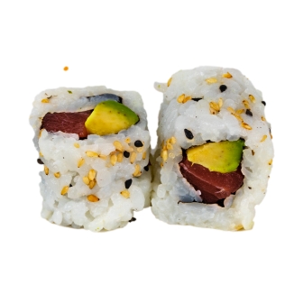 Roulleaux de Maki inversés parsemés de sésame au thon et à l'avocat, servi par 6