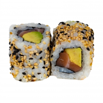 Rouleaux de Maki inversés parsemés de sésame au saumon et avocat, servi par 6