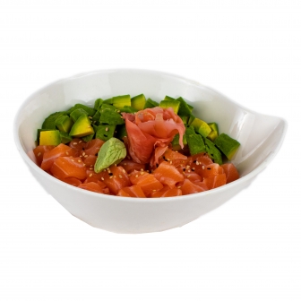 Grand bol de tartare de saumon cru et avocat sur un lit de riz vinaigré